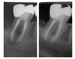 ↑ Ernüchterung nach der Abschlusskontrolle: Das Wurzelkanalsystem scheint ordentlich versorgt, wäre da nicht eine ordentliche Portion sealer (in den Fistelgang) überpresst. ↓ Freude bei der Betrachtung des recalls: Der sealer wurde abtransportiert – die apikalen Verhältnisse scheinen intakt.
